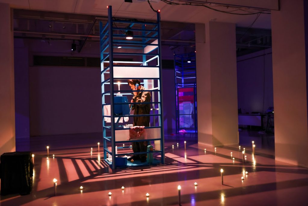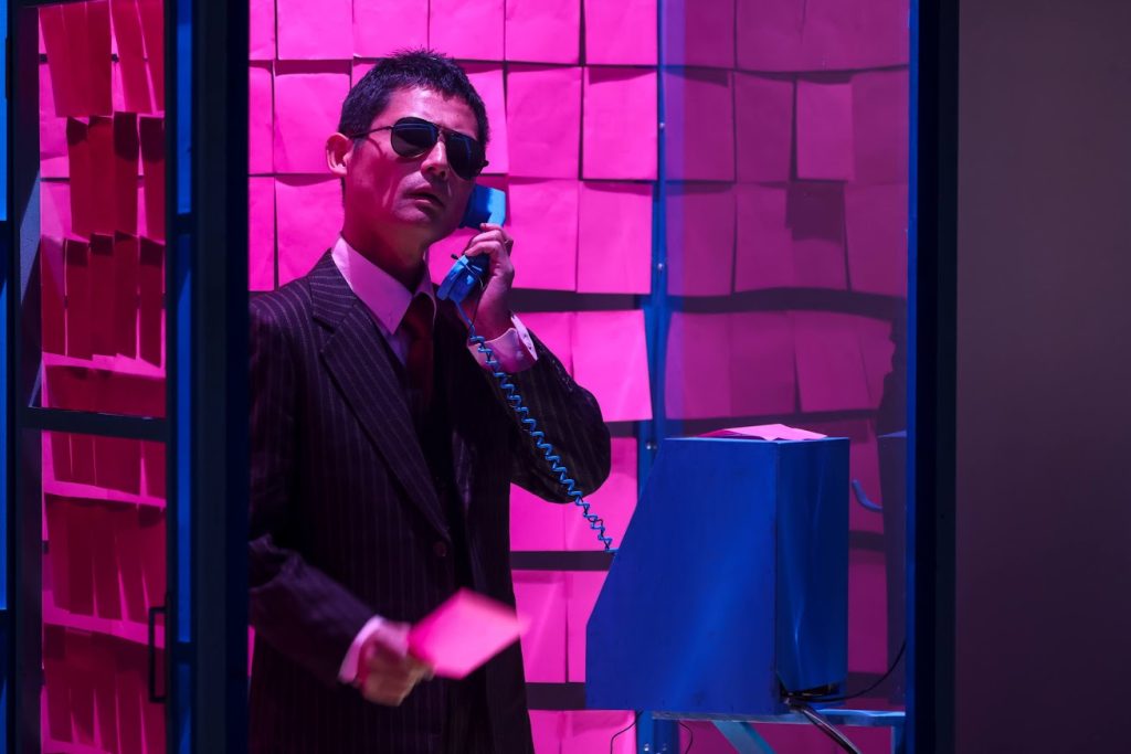 一階と最上階に別れた劇場を電話ボックスによる通話で繋ぎ、俳優が行き来する。